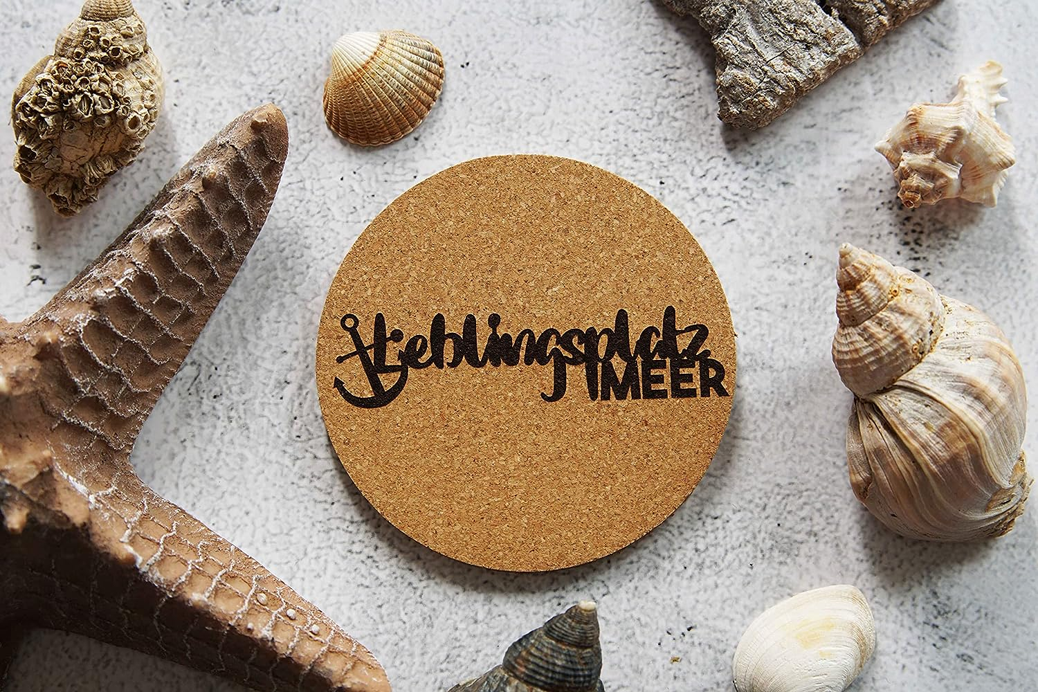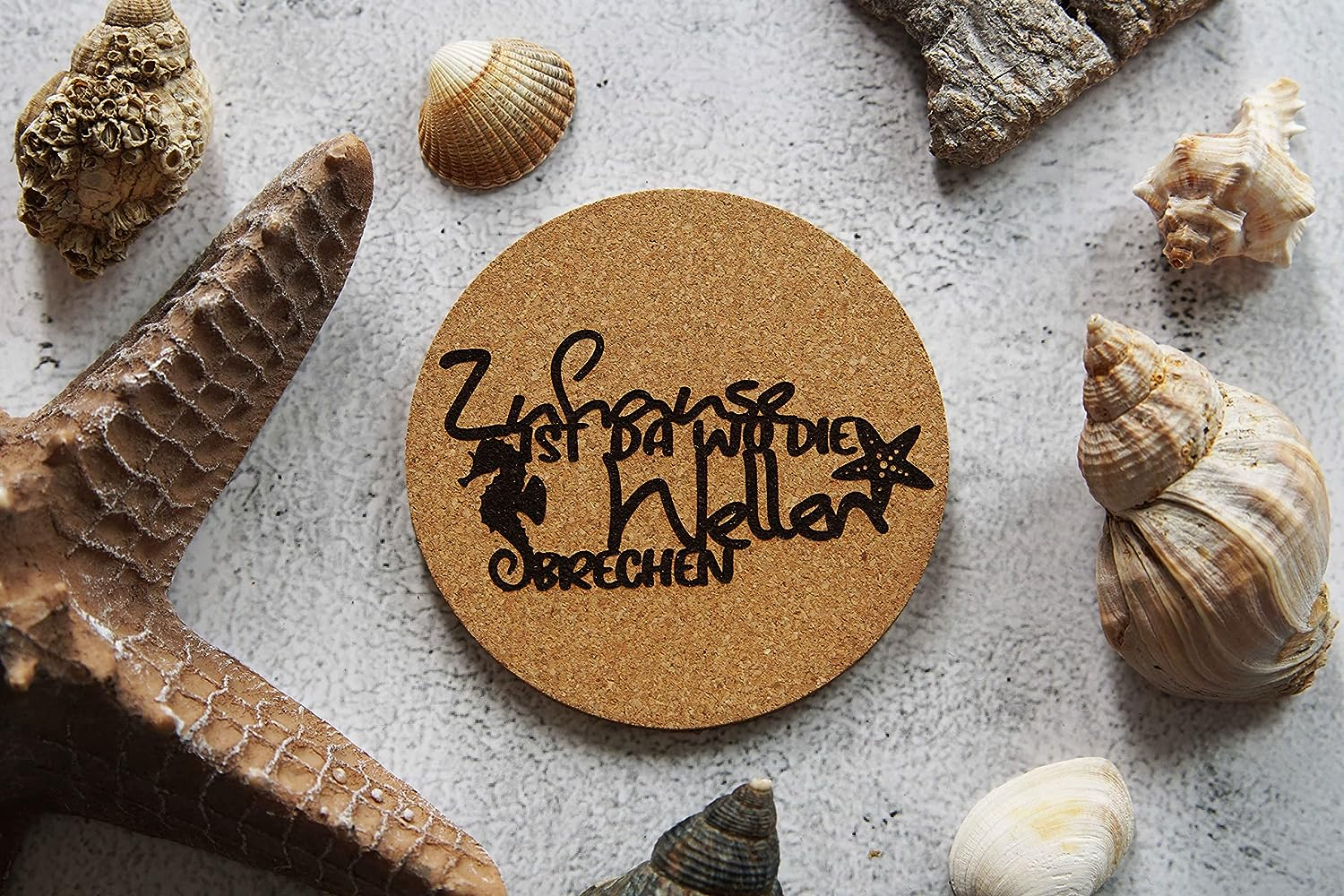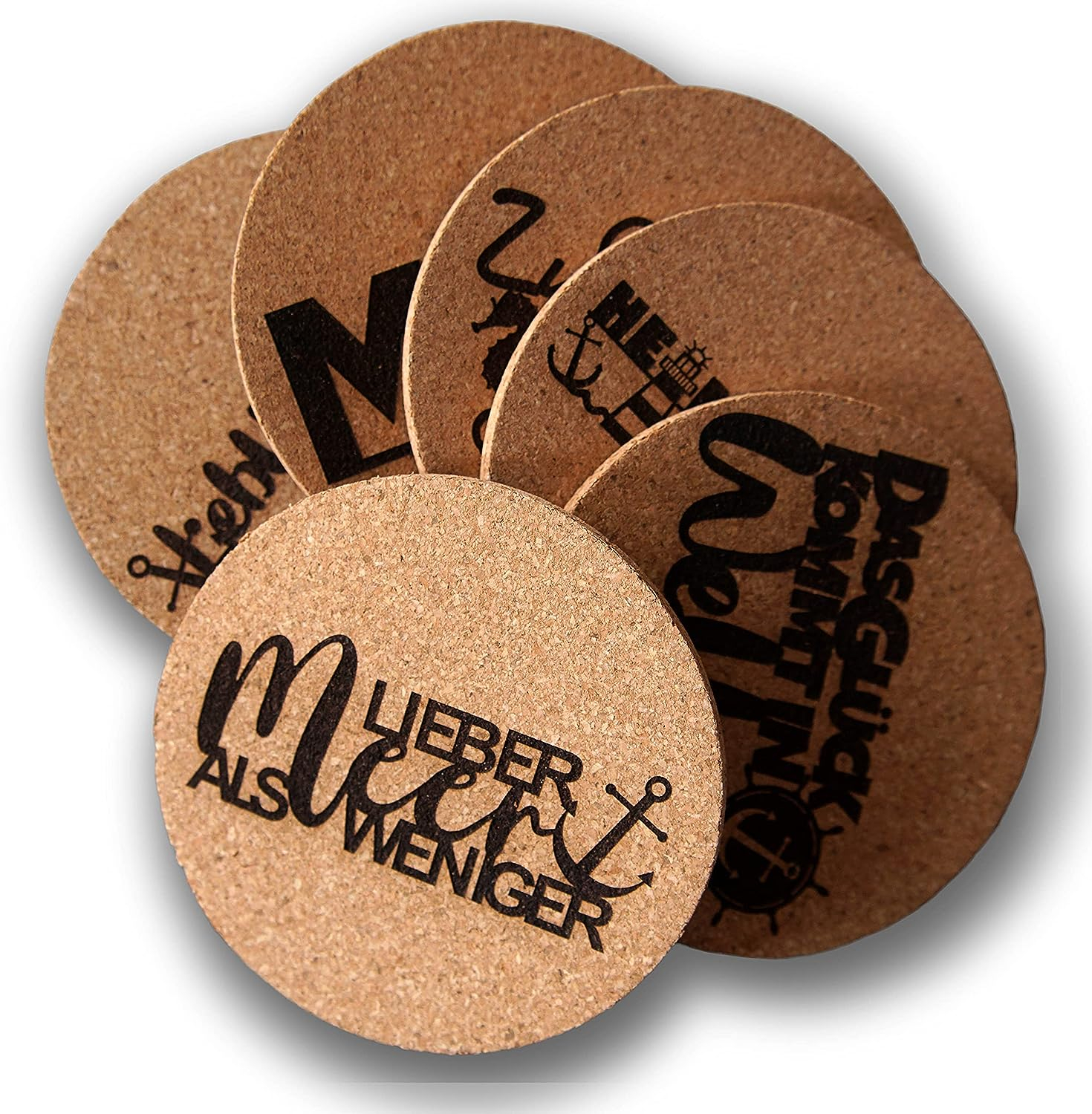 Kork-Untersetzer Set Maritim – 6 Stück – Ein echtes Muss für jeden Meer-Liebhaber! – Dieses Set weckt mit seinem Motiven die Erinnerungen an den vergangenen Urlaub am Meer. – Nützlich und schön. So holst du dir das Meer nach Hause. – Paket beinhaltet 6 Stück – 6 verschiedene Motive mit Sprüchen – Kein verblassender Druck, sondern haltbares Laser-Dekor – Die Untersetzer können Heiß- und Kaltgetränke aufnehmen Hinweis: Dekorationen sind nicht Bestandteil des Kaufes. Das erste Bild zeigt die Übersicht der Kollektion.
