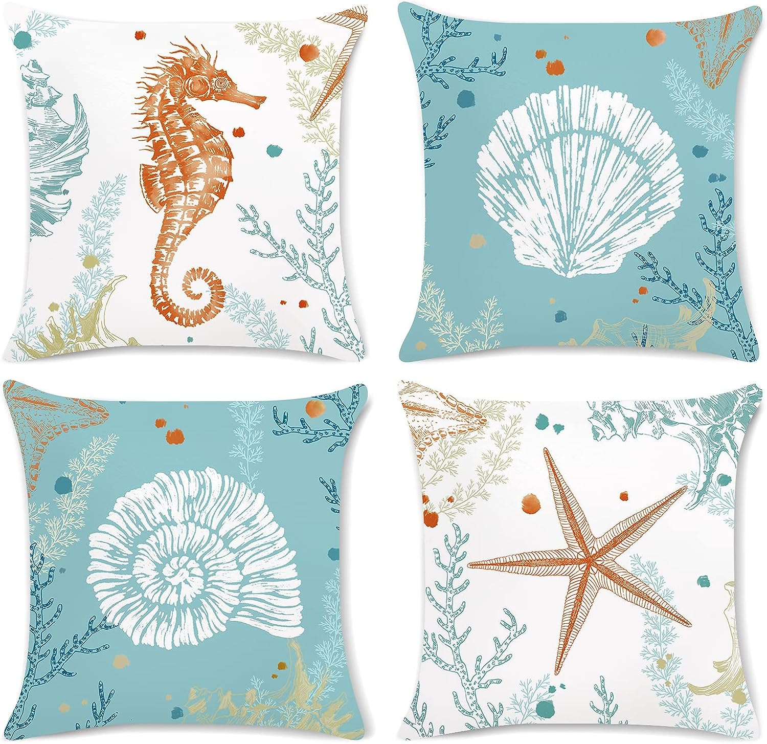 Bonhause 4er Set Kissenbezüge Ozean Strand 45 x 45 cm Seepferdchen Seestern Küsten Blau Samt Soft Dekorative Kissenhülle