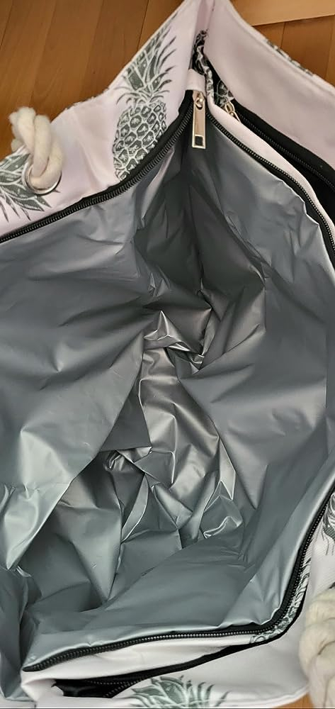 Gesucht war eine Tasche für Badeausflüge, viel Stauraum, wasserdichtes Fach.Das bietet diese Strandtasche mit grünem Ananas-Motiv.2 Reißverschlüsse oben teilen die Tasche mittig, das silbern ausgekleidete Fach dürfte das für nasse Sachen sein. Außen kleine Taschen.Tragegurte sind aus Baumwollseil, da lösen sich die ungesicherten Knoten schon bei Erhalt. Also schnell festziehen und am besten mit etwas Kleber sichern… Sind gerade eben lang genug, um sie über der Schulter tragen zu können.Alle verwendeten Materialien sind „günstig“ in der Anmutung, die Tasche riecht auch etwas chemisch.Also kein Qualitätsprodukt, aber brauchbar für den Ausflug. Evtl. selber bessere/ haltbarere Trageriemen dranmachen. Und leider großer ökologischer Fußabdruck durch made in China.