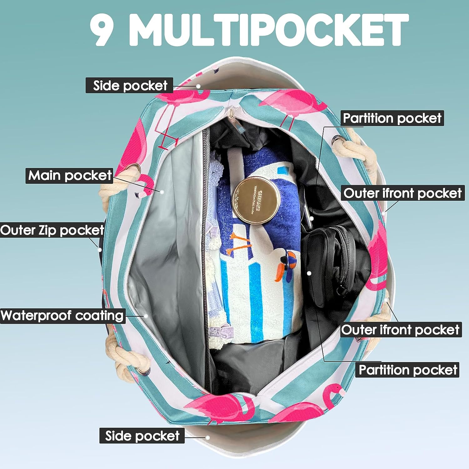 Unsere damen strandtasche ist mit einer speziellen wasserdichten Innentasche ausgestattet, die sich von der Haupttasche mit normalem Fach dadurch unterscheidet, dass sie nasse Handtücher, schmutzige Kleidung und Toilettenartikel aufnehmen kann.