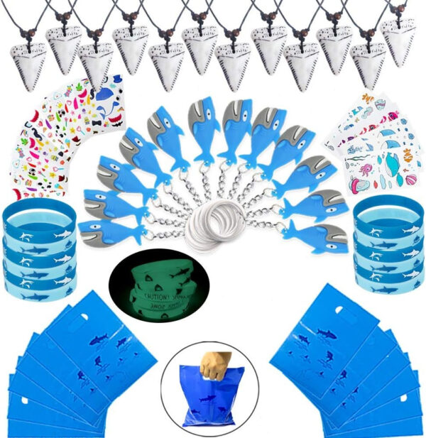 Hai Shark Party Favoriten Zubehör Pack -Shark Tooth Halskette Tattoo Sticker Shark Geschenktasche Shark Shark Armband Pin Back Button für Kinder unter dem Meer /Geburtstag / Goody Bags (66 pcs /Set)