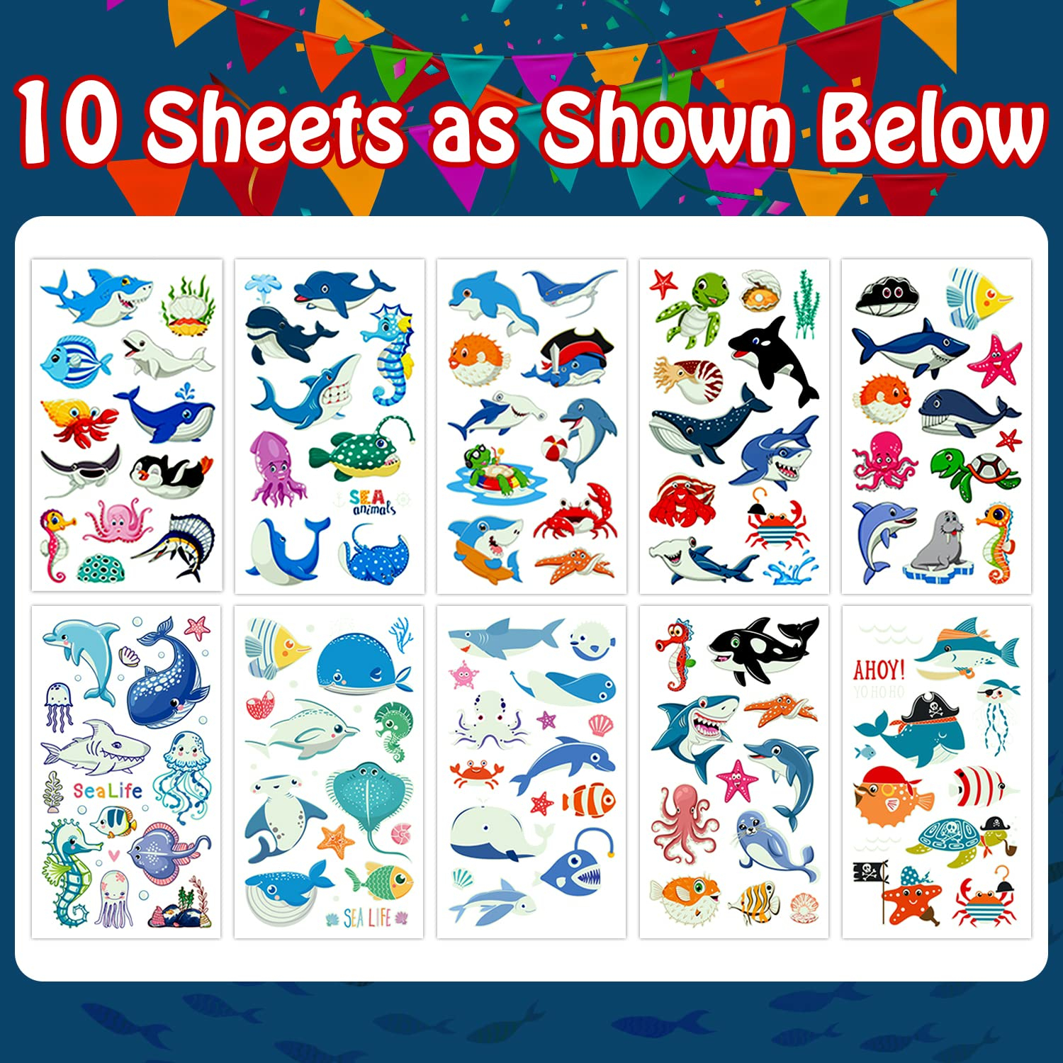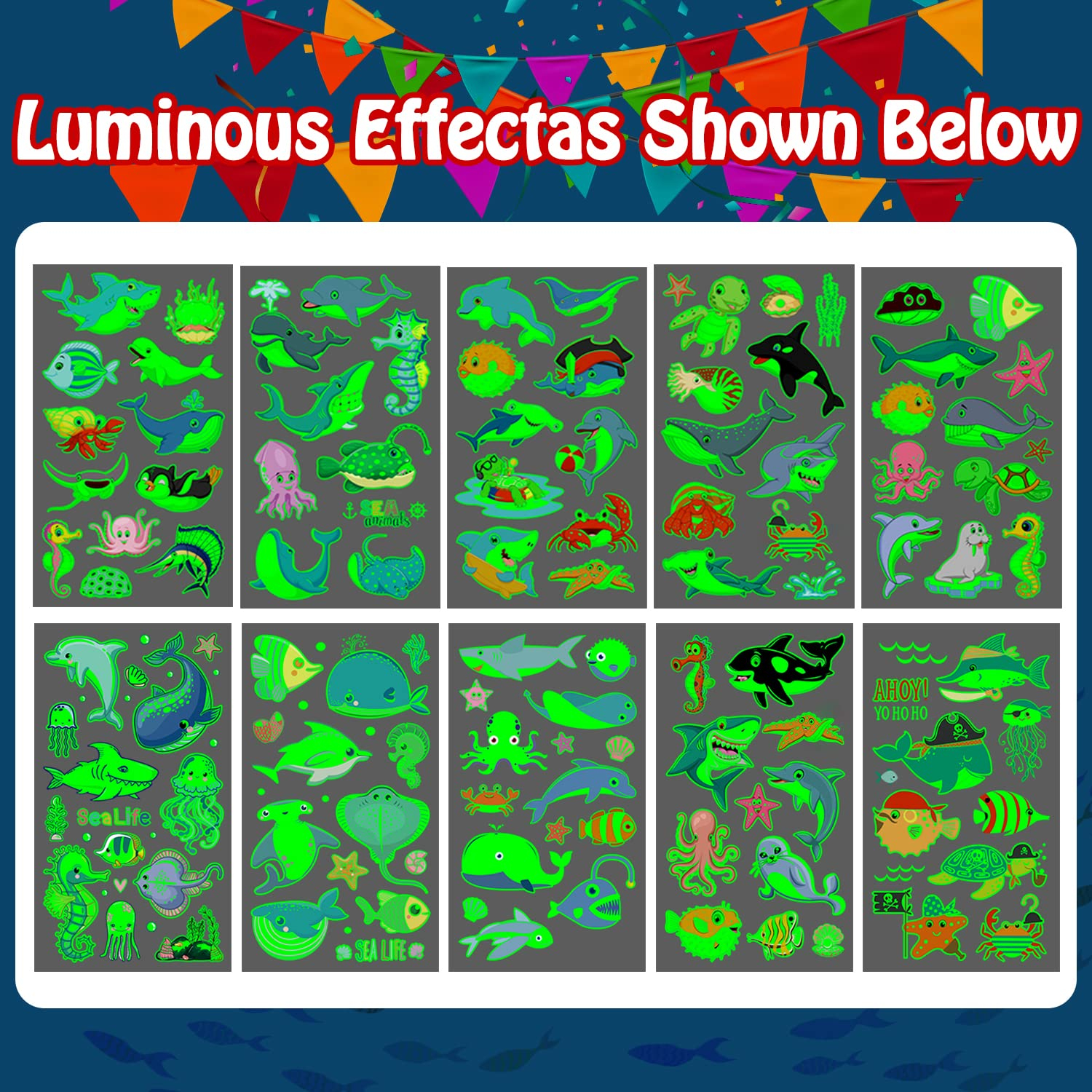 Leesgel Tattoo Kinder Jungen, 140 Stück Leucht Kindertattoos Aufkleber Kinder Meerestiere Hai Sticker, Unter dem Meer Deko