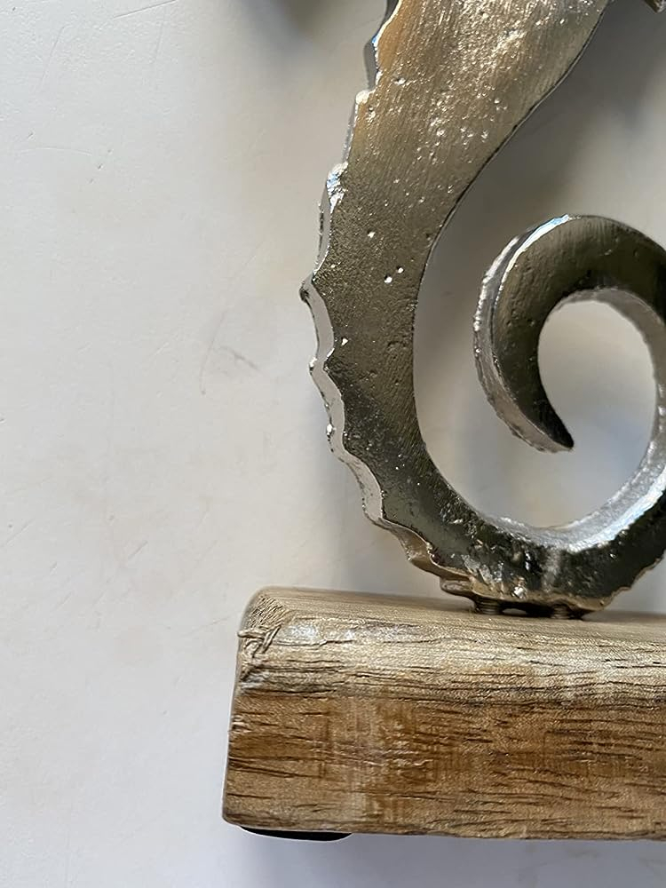 - Dekorative Seepferdchen Figur aus Aluminium (vernickelt) auf einem Standfuß aus Mangoholz. Farbe: silber, braun.