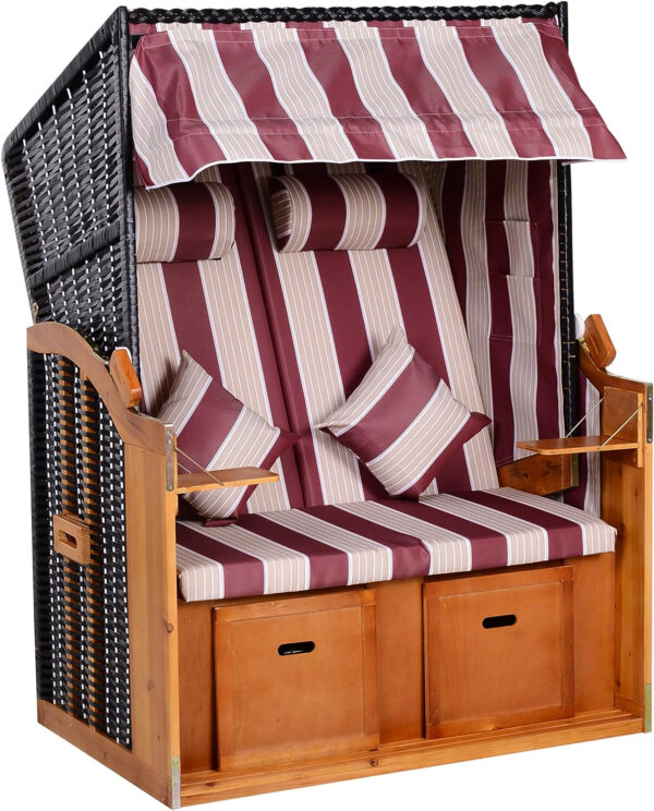 - Praktisch: Der Strandkorb für zwei Personen ist mit zwei Klapptischen ausgestattet und verfügt über Taschen an den Innenseiten, in denen Sie zum Beispiel Zeitschriften oder Bücher aufbewahren können. Bei Bedarf ziehen Sie das Sonnendach heraus.