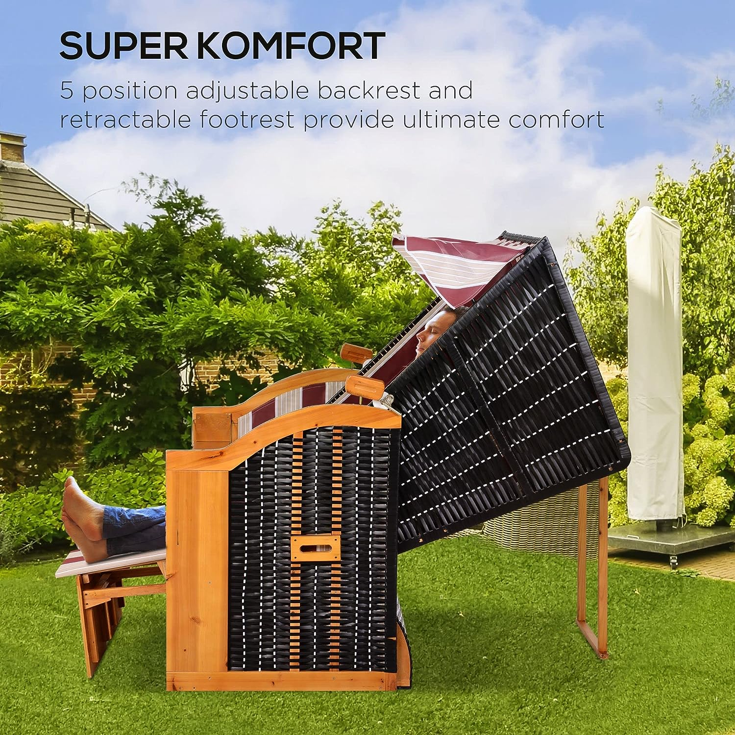 - Individuell Verstellbar: Die Rückenlehne des Strandkorbs ist fünfstufig verstellbar. Damit können Sie sich bequem um bis zu 150° zurücklehnen. Für noch mehr Liegekomfort können Sie zudem die Fußstützen herausziehen.