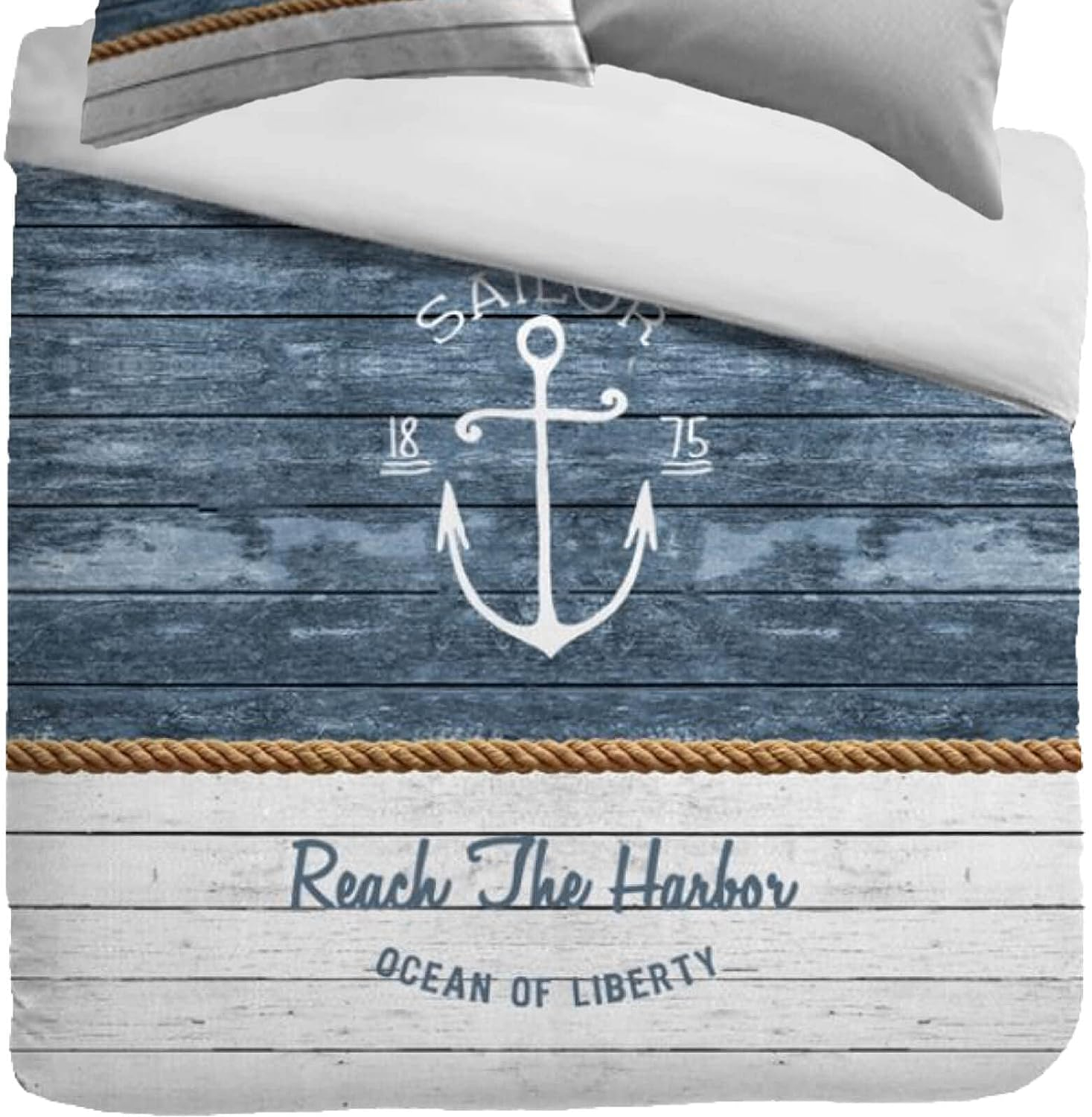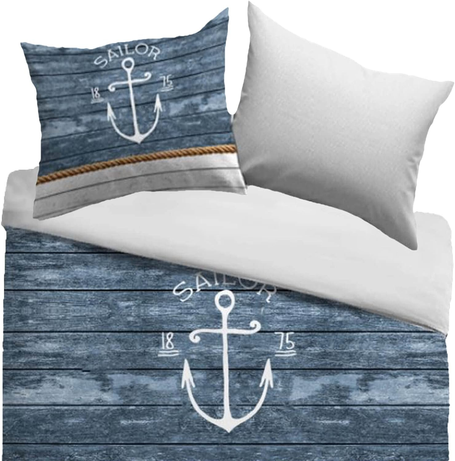 Die Wendebettwäche kjern au der Kollektion ognamo von Kayori präentiert ich in einem maritimen Deign. Blau und Weiß getrichene chiff-Bretter werden durch ein Tau (chiffeil) getrennt. Der pruch ‚Reach the Harbor‘ – ‚Ocean of Liberty‘ owie der Anker mit dem chriftzug ‚ailor‘ (eemann) runden da eefahrer-Deign harmonich ab. Erreichen ie in Ihren Träumen den Hafen und fühlen ie ich icher und geborgen. Der Kienbezug zeigt da gleiche Motiv während die Abeite in hellen Weißton gehalten i Erleben ie allerbeten chlafkomfort mit der au 100 Prozent gefertigten Bettwäche.p&nbp;/p pUm die Farbqualität zu bewahren müen farbintenive Artikel bei den erten Wächen unbedingt mit der auf dem Wachzettel angegebenen Temperatur und nicht darunter gewachen werden./p pDekorationartikel auf dem Bild ind nicht Betandteil diee e. Unterchiedliche Bildchirmeintellungen können zu leichten Farbabweichungen im Vergleich zum Originalprodukt führen./p