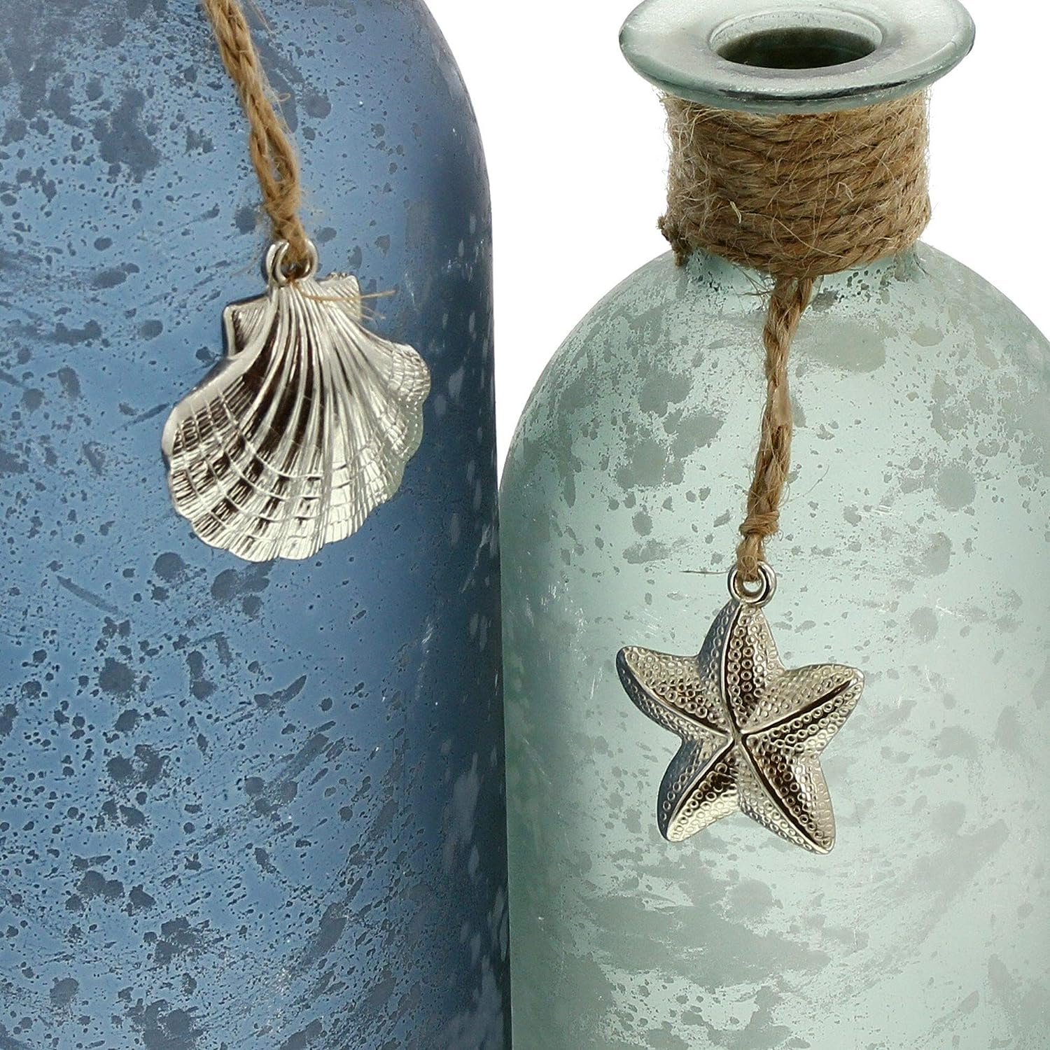 In schönen Blau- und Grüntönen. Satiniertes Glas mit weißen Sprenkeln. Hübsch verziert mit Sisalschnur. Kleinem Seestern und Muschel. Maße: Ø 7 x 20 cm, Ø 8 x 26 cm, nicht spülmaschinenfest.