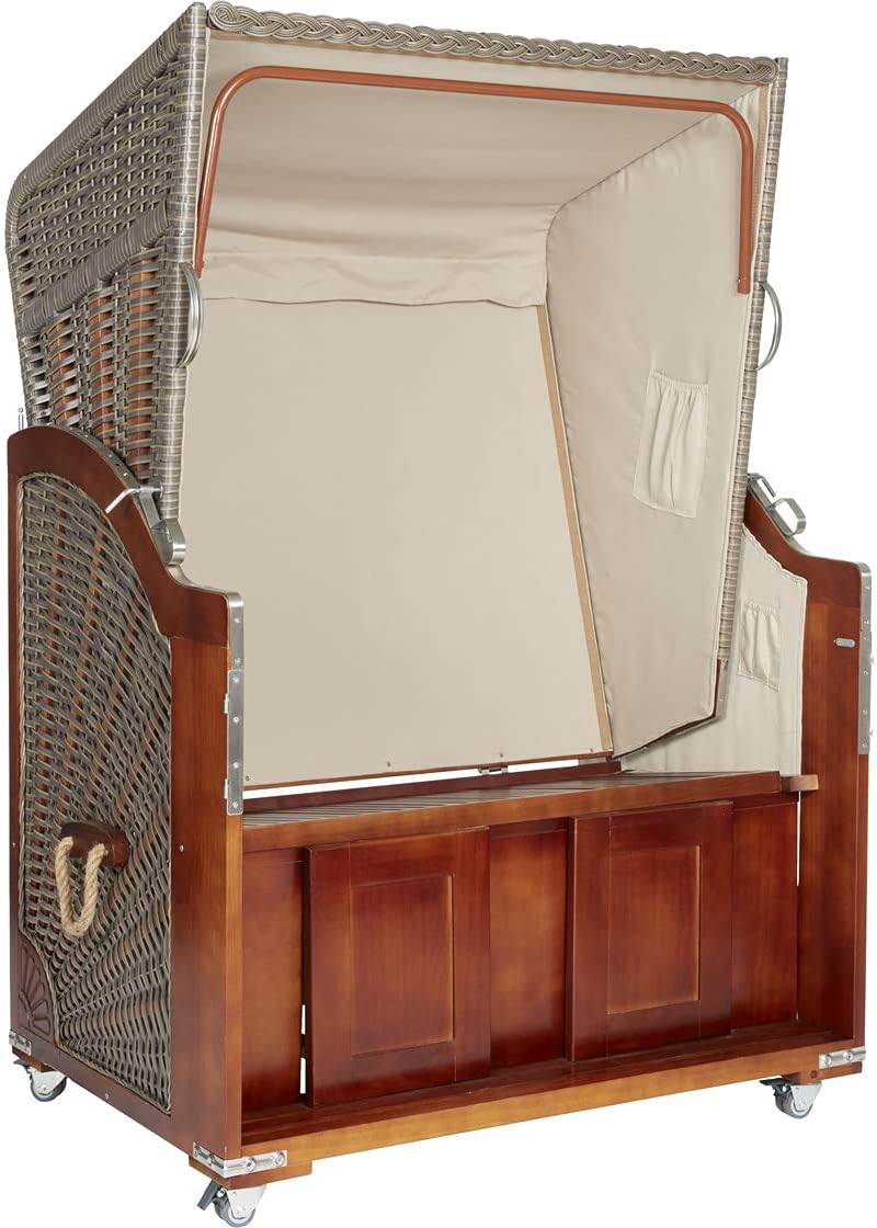 • LIEFERUMFANG – Der fertig montierte Strandkorb aus Pinie hat einen Polyrattan Geflecht in grau. Zu dem Gartenmöbel Set gehören, Rollen, 1 Schutzhülle, 2 Nackenkissen, 2 Zeitungs- und 2 Smartphonetaschen, 2 Wurfkissen, 2 Schwenktische und 2 Fußstützen