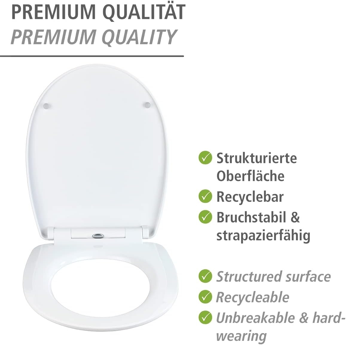 • Akzente setzen: Der mehrfarbige Aufdruck und die fühlbare Struktur auf dem Klodeckel macht den WENKO Toilettensitz aus hochwertigem und recyclebarem Thermoplast zum dekorativen Highlight in jedem Bad und WC